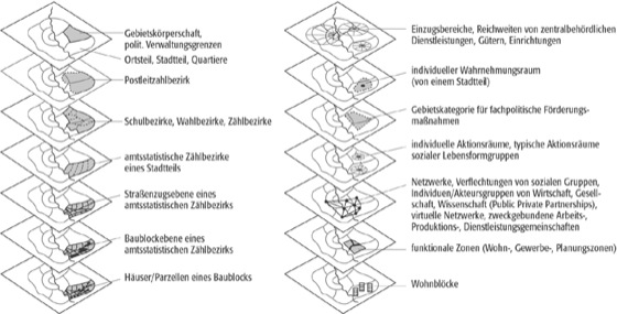 Stadtanalyse, ursprünglich aus soziologischen und wirtschaftswissenschaftlichen Modellen abgeleitete Untergliederung des Stadtgebietes in Struktureinheiten. Nach der Abgrenzung des Stadtraumes werden die innerstädtischen Strukturen aufgrund von verschiedenen Untersuchungskriterien erfasst ( Abb. ): angewandte Stadtanalyse, aktionsräumliche Stadtanalyse, funktionale Stadtanalyse, funktionsräumliche Stadtanalyse, kulturgenetische Stadtanalyse, morphogenetisch Stadtanalyse, wahrnehmungsgeographische Stadtanalyse, sozialgeographische Stadtanalyse. Es gibt verschiedene Verfahren der Stadtanalyse. Gängig sind drei Ansätze: a) die graphische Analyse mittels EDV-gestützter thematischer Karten (GIS) von Indikatoren, die erste Aussagen über Verteilung und Verbreitung von Merkmalen im Stadtraum haben, b) die statistische Analyse mittels deskriptiver struktureller multivariater Faktorenanalysen, bei der für die definierten räumlichen Aggregierungsebenen mit Indexwerten gerechnet wird sowie die Distanzgruppierungsverfahren von Indikatorenbündeln (Clusteranalyse), bei der mittels dieser Indexwerte in definierten räumlichen Aggregierungsebenen städtische Teilräume anhand von Merkmalsgruppen klassifiziert werden und c) die statistisch-analytischen (multivariaten) Methoden, die theoriegeleitete Aussagen über Zusammenhänge oder Kausalität zwischen untersuchten Phänomenen erlauben.