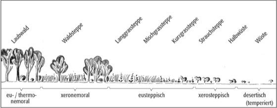 Steppen 1: Steppen 1: Abfolge von Formationstypen von einer relativ feuchten Waldsteppe bis zur trockenen Halbwüste kontinentaler Prägung.