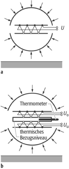 Strahlungsbilanzmesser, Messgeräte, welche die gesamte Strahlungsbilanz bestimmen ( Abb. ). Sie bestehen aus zwei gegeneinander ausgerichteten Pyrradiometern, das sind Strahlungsmessgeräte, welche sowohl die kurz- als auch die langwellige Strahlung erfassen (Pyranometer). Ein Pyrradiometer misst die direkte Sonnen- und die diffuse Himmelsstrahlung sowie die langwellige Strahlung der Atmosphäre aus dem oberen Halbraum, das andere die reflektierte kurzwellige und die langwellige Ausstrahlung der Oberflächen aus dem unteren Halbraum. Beide Werte werden getrennt ermittelt (Bauform b). Die Eigenstrahlung des Pyrradiometers wird aufgrund der Gebertemperatur bestimmt und bei der Berechnung der Bilanz berücksichtigt. Bei einfacherer Bauweise wird durch direkte Koppelung und Verwendung nur einer Thermobatterie die Thermospannung zwischen oberer und unterer Empfangsfläche bestimmt, woraus sich die Strahlungsbilanz unmittelbar errechnen lässt (Bauform a). Die Messung erfasst den Spektralbereich von 0,3 bis 100 μm, bei einigen Geräten bis 50 μm.