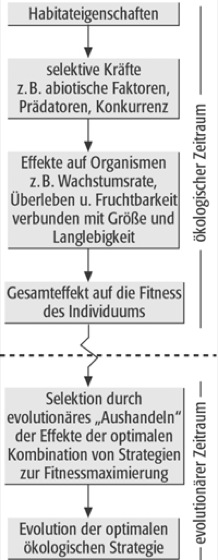 Strategie, Begriff aus der Spieltheorie für ein genetisch determiniertes Verhaltensmuster, das einem Organismus eine Antwort auf eine besondere Umweltsituation ermöglicht. Strategie in der Ökologie bezeichnet kein bewusstes Handeln. Ökologische Strategie (life history strategy) bezeichnet die Gesamtheit aller Lebensäußerungen (Anpassungen) einer Art ( Abb. 1 ), darunter die Strategie der Lebensform und die Reproduktionsstrategie. Komplexe Strategie-Selektions-Systeme mit dem Habitat als Spielraum wurden von verschiedenen Wissenschaftlern erstellt ( Abb. 2 ). Grime hat für Pflanzen drei Strategien, die Kompetitive (C), die Stress- (S) und die Ruderal-Strategie (R) in Abhängigkeit der relativen Bedeutung der Selektionskräfte Konkurrenz, Störung und Stress aufgestellt (C-R-S-Strategie).
