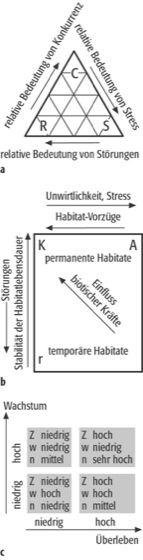 Strategie 2: Strategie 2: Strategie-Selektions-Systeme verschiedener Wissenschaftler: a) nach Grime (für Pflanzen: C=Konkurrenzstratgie, R=Ruderalstrategie, S=Stress-Toleranz-Strategie); b) nach Southwood und Greenslade (r=Anpassung an gestörte, nur temporäre Habitate, K=Anpassung an permanente, günstige Habitate, A=Anpassung an ungünstige, extreme Habitate) und c) nach Sibly und Calow.