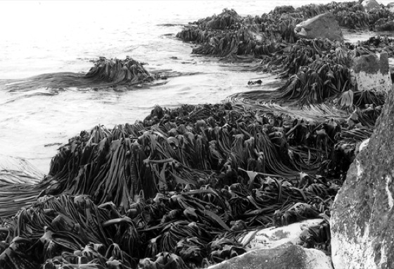 Tangwälder, dichte Bestände sehr großwüchsiger Braunalgen im Sublitoral oder auch direkt an einer Felsküste im Gezeitenbereich kühler und kalter Meere. Die meist aus Riesentangen (bis über 40 m lang) der Arten Macrocystis und Nereocystis bestehenden, am Meeresboden verankerten Wälder mit auf dem Wasser ausgebreitet schwimmenden Blattorganen (Auftrieb durch gasgefüllte blasenartige Organe) sind ein geschützter Lebensraum zahlreicher Robben, Seelöwen, Seeotter, Fische, Muscheln oder Krebse, werden aber auch vom Menschen geerntet und zu Alginaten verarbeitet und sind schon von daher gefährdet. Ihre Vorkommen liegen an den Kaltwasserküsten beider Halbkugeln, so von Alaska bis Südkalifornien, um Feuerland, oder an den südatlantischen Inseln bis Neuseeland. Auf der Südhalbkugel treten dazu bis über 30 kg schwere und viele Meter lange Riesentange des Felslitorals wie Durvillaea ( Abb. ) oder Carpophyllum, die einen wirksamen natürlichen Brandungsschutz abgeben können. An den west- und nordeuropäischen Küsten sind die Braunalgen nur maximal wenige Meter lang, oft kleiner, bilden aber ebenfalls dichte Teppiche und Bestände im Eu- und Sublitoral (Laminaria, Fucus, Himanthallia).