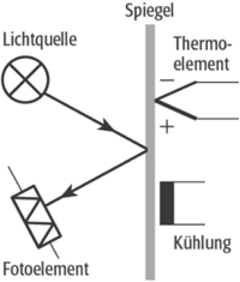 Tau: Tau: Prinzip eines Kondensationshygrometers. Grundlage ist ein blankpolierter Metallspiegel, der mit einer Lichtquelle bestrahlt wird. Das Fotoelement empfängt bei blankem Spiegel aufgrund spiegelnder Reflexion eine hohe Lichtintensität. Zur Messung des Taupunkts wird der Spiegel abgekühlt, bis die gemessene Lichtintensität schlagartig abnimmt. Zu diesem Zeitpunkt ist Wasser auf dem Spiegel kondensiert (d.h. der Taupunkt erreicht) und die empfangene Lichtintensität durch diffuse Reflexion drastisch reduziert. Die Taupunkttemperatur (Temperatur des Spiegels zum Zeitpunkt der Kondensation) wird mit einem Thermoelement bestimmt.