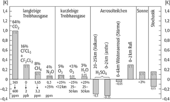 Durch menschliche Aktivitäten wurden und werden der Atmosphäre eine Vielzahl von klimawirksamen Spurengasen zugeführt. Zu nennen sind Kohlendioxid (CO 2), das bei allen Verbrennungsprozessen freigesetzt wird, Methan (CH 4), welches bei der Tierhaltung, dem Reisanbau und beim Betrieb von Mülldeponien entsteht, Chlorflourmethane (CFM) und Flourchlorkohlenwasserstoffe (FCKW), die vom Menschen künstlich erzeugt werden, Distickstoffoxid (N 2O), das besonders durch Überdüngung in die Atmosphäre gelangt sowie troposphärisches Ozon, welches bevorzugt durch photochemische Reaktionen der Kfz-Abgase gebildet wird. Es besteht ein enger Zusammenhang zwischen dem Wachstum der Weltbevölkerung und des Weltwohlstandes und dem Anstieg der Emissionen dieser klimawirksamen Spurengase. Die Abbildung zeigt die nach den vorliegenden Klimamodellrechnungen anzunehmende globale Temperaturzunahme der bodennahen Luftschicht bei einer Verdopplung des Anteils einiger klimawirksamer Spurengase durch den Menschen. Zum Vergleich sind auch die globalen Temperaturänderungen angeführt, die durch natürliche und anthropogene Stäube, durch die Variationen der solaren Aktivität und interne Klimafluktuationen nach den Klimamodellrechnungen zu erwarten sind. Einen weiteren, bis jetzt noch nicht völlig geklärten Einfluss auf die globale Erwärmung hat auch der Anteil an Meereis an den Polkappen der Erde.