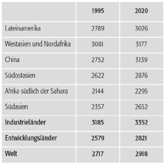 Unterernährung: Unterernährung: Verfügbare Kalorien 1995 und 2020 in Kcal pro Kopf und Tag nach Regionen.