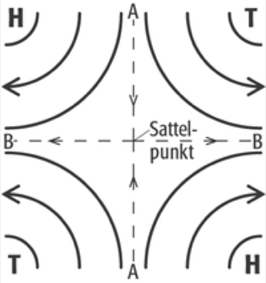 Viererdruckfeld, Druckfeld, bei dem sich zwei Hochdruckgebiete und zwei Tiefdruckgebiete kreuzweise gegenüberliegen ( Abb. ). Entlang der sog. Kontraktionsachse werden Luftteilchen von beiden Seiten herangeführt, entlang der sog. Dilatationsachse nach beiden Seiten abgeführt. Der Schnittpunkt der beiden Achsen wird als Sattelpunkt bezeichnet. Bekanntes Beispiel eines Viererdruckfeldes ist eine Druckverteilung im Großraum des Nordatlantischen Ozeans, hier stehen die Aktionszentren Islandtief und Azorenhoch Tiefdruckgebieten im Bereich der Bermuda-Inseln und Hochdruckgebieten nahe Neufundland gegenüber. Dadurch werden Polar- und Subtropikluft gegeneinandergeführt und frontale Luftmassengegensätze in bestimmten Gebieten verschärft. planetarische Frontalzone.