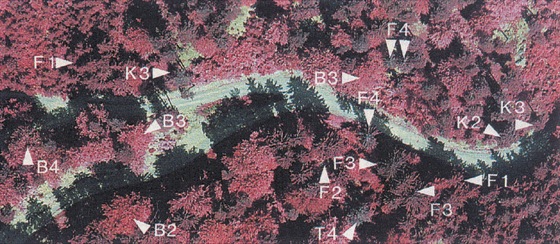 Waldschadenserhebung: Waldschadenserhebung: Kronenzustand von Einzelbäumen im Farbinfrarotluftbild. Aufgrund von Farb- und Strukturmerkmalen kann ein geschulter Interpret die Baumkronen (F=Fichte, B=Rotbuche, T=Tanne) nach ihren Schadenstufen (1=sehr gut bis 4=absterbend) einordnen. Geschädigte Laubbäume erscheinen im Luftbild hellrot (Rotbuche), geschädigte Nadelbäume mit deutlich strahligen Hauptästen. Aufnahmezeitpunkt: Hochsommer, Bildmaßstab: 1:6000.