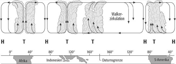 Walker-Zirkulation, äquatorparallel ausgerichtete, geschlossene Zirkulationszelle, in der Luft über den – durch die Kaltwasserzufuhr des Humboldtstromes – relativ kalten Ozeangebieten des östlichen Pazifiks absinkt und über den deutlich wärmeren Ozean- und Landflächen im indonesischen Bereich des Westpazifiks aufsteigt. Die absinkende Luft bedingt hohen Bodenluftdruck im östlichen, die aufsteigende tiefen Bodenluftdruck im westlichen Pazifik. Die Walker-Zirkulationszelle wird durch eine äquatorparallele Ostströmung der Passate im Bodenniveau und eine äquatorparallele Westströmung in der Höhe unterhalb der Tropopause geschlossen. Diese 120 Längengrade (von 120°W bis 120°E) umfassende Zirkulationszelle wurde in den 1920er-Jahren von G. Walker (1868-1958) erstmals beschrieben. Später konnte gezeigt werden, dass ähnliche Zirkulationszellen auch im tropischen Atlantik sowie abgeschwächt und unregelmäßig auch im westlichen Indischen Ozean auftreten ( Abb.). Die Walker-Zirkulation ist eine direkte thermische Zirkulation, die quasiperiodischen Fluktuationen unterliegt, die als Southern Oscillation bekannt sind. Diese werden im tropischen Pazifik dadurch ausgelöst, dass infolge der starken bodennahen Ostströmung mehr Oberflächenwasser entlang dem Äquator westwärts transportiert wird, als im Westpazifik polwärts auf beide Hemisphären abfließen kann. Überschreitet die Erhöhung des Meeresspiegels im Westpazifik kritische Grenzwerte, so strömt vermehrt sehr warmes Wasser in Form des äquatorialen Gegenstromes in den östlichen Pazifik und überlagert infolge seiner geringen Dichte die deutlich kälteren Ozeanflächen des Ostpazifiks, während im Westpazifik kühleres Tiefenwasser an die Oberfläche gelangt. Eine Temperaturzunahme von 2-3°C vor der südamerikanischen Westküste ist die Folge. Da diese bevorzugt in der Weihnachtszeit auftritt, wird sie als El Nino bezeichnet. Die Erwärmung des Ost- bei gleichzeitiger geringer Abkühlung des Westpazifiks hat eine Richtungsumkehr der Walker-Zirkulation zur Folge.