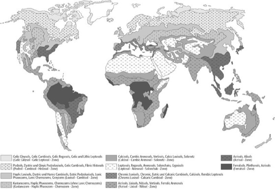 Weltbodenkarte, FAO/Unesco-Weltbodenkarte, Kartenwerk der FAO (Food and Agricultural Organization of the United Nations) im Maßstab 1:5.000.000 auf der Basis der FAO-Bodenklassifikation. Abb.