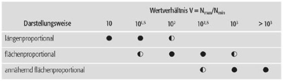 Wertmaßstab: Wertmaßstab: Wertverhältnis (V) und Eignung (ausgefüllter Kreis=geeignet) der Darstellungsweise (Typ des Wertmaßstabes).