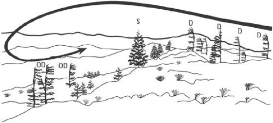 Windschur: Windschur: Windgeformte Bäume auf beiden Seiten eines Kammes: verformte Bäume auf der Seite des vorherrschenden Windes (D), symmetrisch ausgebildete Bäume im unmittelbaren Windschutz des Kammes (S) und der Hauptwindrichtung entgegengesetzt verformte Bäume tiefer am Hang (OD). Der Pfeil zeigt eine reliefbedingte Umkehr der Windrichtung an.