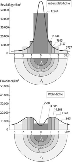 Wohndichte: Wohndichte: Verteilung von Arbeitsplätzen und Wohnbevölkerung in einer Großstadt F1=2,01km2, F2=2,31km2, F3=2,55km2, F4=5,49km2, F5=15,7km2).