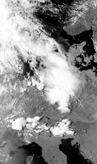 Wolkencluster: Wolkencluster: NOAA-11 Satellitenbild (AVHRR) des Kölner-Hagelunwetters vom 4.7.1994 (15:35 UTC). Über den Benelux-Staaten und einem Großteil von Deutschland befindet sich ein initialer MCC, der sich im Bereich einer Kaltfront gebildet hat. Am Alpennordrand haben sich weitere Multizellengewitter ausgebildet.