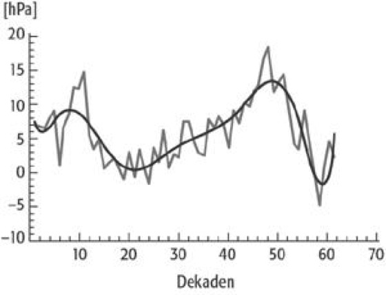 Zonalindex: Zonalindex: Dekadenmittel des hemisphärischen Zonalindexes zwischen Oktober 1987 und Mai 1989, geglättet mit einem Polynom 8. Grades.