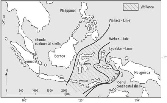 zoogeographische Linie, eine Grenzlinie zwischen oder innerhalb von Faunenreichen, in denen sich die Verbreitungsgrenzen von Tierarten, meist von Wirbeltieren häufen. Man unterscheidet zwischen (a) marinen und (b) festländischen zoogeographischen Linien. Wichtige (marine) zoogeographischen Linien befinden sich in der indoaustralischen Inselwelt ( Abb.). Die Wallace-Linie bildet die Ostgrenze vieler orientalischer Wirbeltiere und die Westgrenze australischer Arten. Die Lydekker-Linie ist die westliche Verbreitungsgrenze strikter australischer Arten. Beide schließen die Wallacea, das indoaustralische Zwischengebiet oder biogeographische Übergangsgebiet, ein. An der, die Wallacea durchlaufenden, Weber-Linie besteht ein Gleichgewicht zwischen orientalischen und australischen Faunenelementen. Die Wallace- und die Lydekker-Linie verlaufen entlang von 200m-Isobathen, die jeweils den asiatischen bzw. den australischen Schelfbereich gegen den Archipel der Wallacea begrenzen. Diese Schelfbereiche fielen bei den eiszeitlichen Meeresspiegelabsenkungen trocken (Landbrücke).