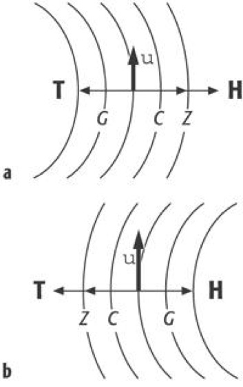 zyklostrophische Strömung: zyklostrophische Strömung: Parallelogramm der Windvektoren bei der zyklostrophischen Strömung mit a) zyklonaler Drehung um ein Tiefdruckgebiet und b) antizyklonaler Strömung um ein Hochdruckgebiet. υ=Wind, G=Gradientkraft, C=Corioliskraft, Z=Zentrifugalkraft, T=Tiefdruckgebiet, H= Hochdruckgebiet.