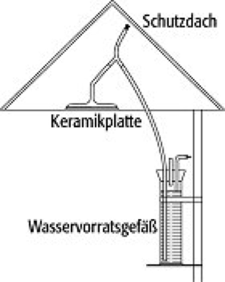 Evaporimeter, Gerät zur Messung der örtlichen potentiellen Verdunstung mit Hilfe von feuchten Probekörpern. Dabei unterscheidet man zwischen Geräten, bei denen feuchte Papierproben (Atmometer) oder Keramikplatten (Evaporometer) der Verdunstung ausgesetzt werden ( Abb. ). Diese Probekörper werden mit einem mit Wasser gefüllten Gefäß verbunden, das über Skalen verfügt, an der die durch die Verdunstung bedingte Wasserabnahme abgelesen werden kann.
