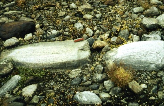 Geschiebe: Geschiebe in einer Grundmoräne (Größenvergleich Taschenmesser). Die Geschiebe sind in Fließrichtung des ehemaligen Gletschers eingeregelt. Geschiebe: