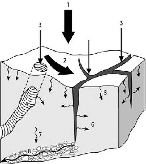 Abflußprozeß 1: wichtige Fließprozesse im Boden mit Niederschlag (1), Landoberflächenabfluß (2), Versickerung in die Makroporen (3), Fließen in den Makroporen (4), Versickerung in die Makroporen durch die Bodenoberfläche (5), Versickerung aus den Makroporen in die Mikroporen (6), Versickerung in den Mikroporen (7) und schneller, lateraler, unterirdischer Abfluß auf bevorzugten Fließwegen in Makroporen hochdurchlässiger Schichten (8). Abflußprozeß 1: