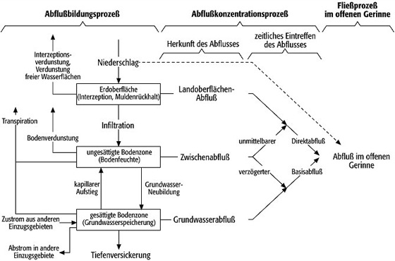 Die Abflußbildung wird beeinflußt durch die Prozesse der Schneedeckenbildung, der Interzeption, der Verdunstung, der Infiltration und der Wasserspeicherung im Oberflächen-, Boden- und Grundwasser. Es handelt sich dabei um Prozesse, die sowohl auf den Landoberflächen als auch im Boden, in vertikaler Richtung entweder gleichzeitig oder mit geringfügiger zeitlicher Verschiebung ablaufen. Durch Zwischenspeicherung auf den Vegetationsoberflächen (Interzeption) und den Landoberflächen (Schneedecke, Muldenrückhalt), wobei ein Teil des Wassers durch den Verdunstungsprozeß in die Atmosphäre zurückgeführt wird, tritt eine Verminderung des Niederschlagswassers ein (Oberflächenrückhalt).