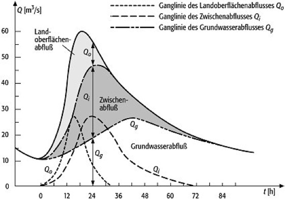 In einen Vorfluter eintretendes Wasser aus Landoberflächen-, Zwischen- oder Grundwasserabfluß führt zu einer Ansammlung von Wasser oder zu einer Erhöhung der Wasserführung. Die zeitlichen Schwankungen der Wasserführung werden durch die Abflußganglinie charakterisiert ( Abb. 4 ).