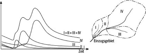 Abflußprozeß 5: Entstehung einer Durchflußganglinie aus Zuflüssen von Teilbereichen des Einzugsgebietes. Abflußprozeß 5: