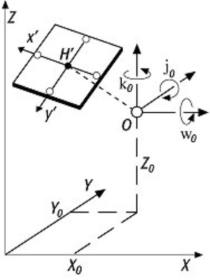 äußere Orientierung, Parameter zur Beschreibung der Orientierung des Bildkoordinatensystems (Bildkoordinaten) eines Bildes im Objektraum (Objektkoordinaten). Die Elemente der äußeren Orientierung sind die Objektkoordinaten des Projektionszentrums0: X0, Y0, Z0 sowie die Rotationen des Bildkoordinatensystems um drei Raumachsen. Für Luftbilder sind dies die Längs- und Querneigung sowie die Kantung des Bildes φ0, ω0, κ0 ( Abb. ).