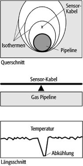 a) Detektion und Lokalisierung von Leckagen an Pipelines: Leckagen an unterirdisch verlegten Gas-, Öl- oder Produktenpipelines verursachen wirtschaftliche Verluste und bilden ein erhebliches Risiko für Umwelt und Bevölkerung. Pipelines werden daher mit Hilfe verschiedener Methoden überwacht. Temperaturmessungen bieten den Vorteil einer genauen Lokalisierung von Leckagen und der Erfassung auch kleiner Undichtigkeiten. Bei intakten Pipelines erfolgt die Wärmeübertragung durch Wärmeleitung. Bei einer Leckage von Pipelines, an denen Flüssigkeiten (Öl, Wasser oder andere Produkte) austreten, bilden sich in der Umgebung der Leckstelle durch einen advektiven Wärmetransport Temperaturanomalien im Erdboden. Die Größe dieser Anomalie hängt von der Temperaturdifferenz zwischen dem in der Pipeline transportierten Medium und der Bodentemperatur ab. Bei Gaspipelines, bei denen das Gas unter einem Druck bis 6 MPa stehen kann, erfolgt an der Leckagestelle eine Druckentspannung. Entsprechend dem Joule-Thomson-Effekt tritt eine Abkühlung bei Druckentspannung auf. Für Methan beträgt die Temperaturabsenkung ca. 0,5ºC pro 0,1 MPa Druckabfall. Bei Gaspipelines bestehen daher gute Voraussetzungen für die thermische Leckageortung ( Abb. 2 ). Für die Pipelineüberwachung bietet sich v.a. das faseroptische Temperaturmeßverfahren an, da die Meßkabel zwischen zwei Meßstationen eine Länge bis zu 60 km haben können, so daß mit dieser Technik auch lange Pipelineabschnitte überwacht werden können. In ähnlicher Weise erfolgt die Leckageüberwachung von unterirdisch verlegten Fernheizungsleitungen und Frischwasserleitungen.