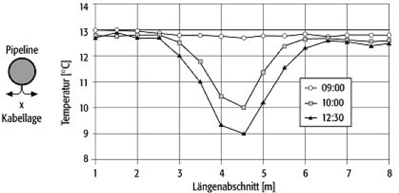 Angewandte Geothermik 2: Temperaturprofile über einer Leckagestelle in einer Erdgaspipeline. Das faseroptische Sensorkabel wurde unter der Pipeline in 6-Uhr-Stellung installiert (links im Bild). Angewandte Geothermik 2: