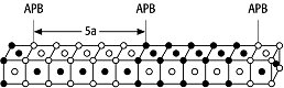 Antiphasengrenze: Prinzipieller Aufbau der Kristallstruktur von CuAu II. Nach jeweils 5 Elementarzellen wechseln sich die Kupfer-Lagen (offene Kreise) mit denen des Goldes (volle Kreise) ab. Mit APB (Anti Phase Boundary) sind die Antiphasengrenzen gekennzeichnet.
