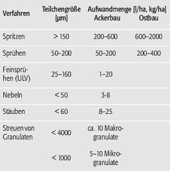 b) Pflanzenschutzmittel: Wichtige Formen der Applikation von Pflanzenschutzmitteln (PSM) sind Spritzen, Sprühen, Beizen, Stäuben, Begasen, Nebeln und Räuchern (Fumigantien). Einsparungen beim Wasserbedarf werden durch die ULV-Technik (ultra low volume spraying) erzielt. Grundsätzliches Problem der Verringerung von Teilchengrößen ist die Abdriftgefahr, der mit unterschiedlichen Techniken zur besseren Anlagerung und Haftung auf dem Zielorganismus begegnet wird ( Tab. ). [HPP]