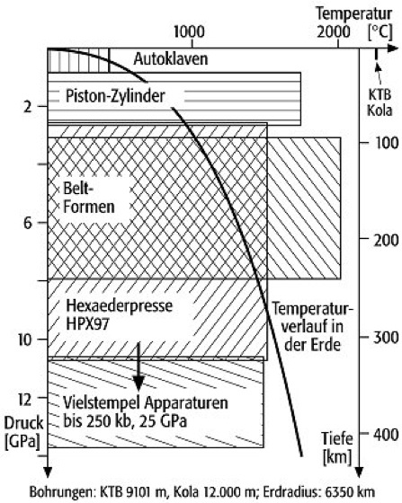 Autoklaven, zur Erforschung der Bildungsbedingungen der Minerale und ihrer Stabilitätsbereiche sind Experimente in geschlossenen Systemen bei erhöhten Temperaturen und Druckbedingungen erforderlich. Autoklaven spielen dabei eine besondere Rolle, da die meisten Reaktionen in der Erdkruste im Bereich bis zu 1000ºC und Drücken bis zu 0,8 GPa stattfinden ( Abb. 1 , Abb. 2 ). Hier lassen sich für entsprechende Untersuchungen Autoklaven einsetzen. Einige Minerale, besonders die des Erdmantels, bilden sich jedoch nur bei sehr hohen Drücken und Temperaturen. Um sie synthetisch herstellen zu können, benötigt man aufwendige Druckapparate (Pressen), die über bestimmte Stempelsysteme Drücke bis zu einigen Kilobar (108 Pa) erzeugen können. Auch die Diamantsynthese ist unter ähnlichen Bedingungen realisierbar. Ebenso werden für die Synthese von Einkristallen und polykristallinen Aggregaten für ihren Einsatz als Werkstoffe in der Technik Autoklaven eingesetzt (Hydrothermalsynthese).