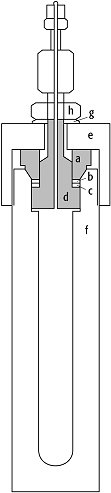 Autoklaven 4: Innenbeheizter Autoklav (schematisch). a = Heizofen; b = Autoklaveninneraum; c = Dichtung; d = Verschlußkopf; e = Verschluß; f = Autoklavenkörper; g = Kühlsystem. Autoklaven 4: