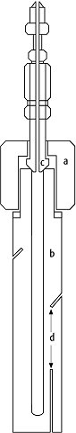 Autoklaven 3b : Tem-Pres-Autoklav mit Konus-Dichtung (schematisch). a = Überwurfverschluß; b = Autoklavenkörper; c = Konusdichtung; d = Thermoelementbohrung.