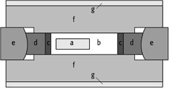 Autoklaven 3a: Tem-Pres-Autoklav mit Bridgman-Dichtung (schematisch). a = Druckring; b = Paßring; c = Dichtung; d = Druckstempel; e = Überwurfverschluß; f = Autoklavenkörper; g = Unterlegscheibe; h = Kantenmutter.