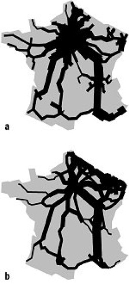 Bandkartogramm: Eisenbahnverkehr in Frankreich: a) Personen-, b) Güterbeförderung. Bandkartogramm: