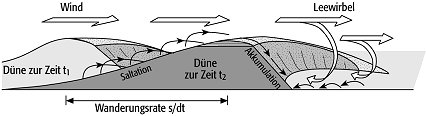 Barchan, Sicheldüne, sichelförmige, auf der Leeseite konkave Querdüne mit flachem, 10-15º geneigtem Luvhang und steilem Leehang. Barchane erreichen Höhen bis 30 m, bei besonders starken Winden auch darüber. Sie entstehen häufig aus Sandschilden oder durch Auswandern aus Leedünen. Voraussetzung ist eine gleichbleibende Windrichtung. Die Erhöhung der Windgeschwindigkeit über dem Luvhang durch vertikale Einengung der Strömung ermöglicht den hangaufwärtigen Transport des Sandes (Saltation). Durch den ständigen Aufprall der Sandkörner wird so eine festere Oberfläche geschaffen. Unmittelbar hinter dem Kamm wird aufgrund der dort nachlassenden Windgeschwindigkeit akkumuliert. Dies führt zur Übersteilung (bis 35º) mit nachfolgender Rutschung, wobei sich am Leehang der natürliche Böschungswinkel für lockeren Feinsand (ca. 33º) einstellt. Auf diese Weise wird nach und nach die gesamte Sandmasse umgewälzt. Da die Umwälzung an den flachen Rändern schneller geht als in der Mitte, bilden sich dort vorauseilende, flachere Spitzen, sogenannte Hörner, die dem Barchan seine typische Sichelform verleihen. Zwischen den Hörnern wird durch gegenläufige Wirbel (Leewirbel) die Oberfläche sandfrei gehalten ( Abb. ). Der Barchan ist die charakteristische Wanderdüne. Festen Untergrund und stetige Windrichtung vorausgesetzt, können große Strecken unter Beibehaltung der Form zurückgelegt werden. Allerdings verlieren Barchane mit der Zeit an Größe, sofern nicht aus den überwanderten Flächen Sand nachgeliefert wird. Die Wandergeschwindigkeit verhält sich bei gleicher Windgeschwindigkeit umgekehrt proportional zur Höhe. Daher können kleinere Barchane größere einholen und deren Luvhänge hinaufwandern. Bei Geländeuntersuchungen wurden Wandergeschwindigkeiten von 20-24 m/a bei 3-5 m hohen Barchanen beobachtet. Wandern Barchane in Gebiete mit wechselnden Windrichtungen ein, verlieren sie ihre symmetrische Form und bilden unterschiedlich lange Sichelenden aus oder werden zu Längsdünen umgeformt (Silk). [KDA]