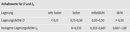 bezogene Lagerungsdichte (Tab.): Anhaltswerte für die Lagerungsdichte D und die bezogene Lagerungsdichte iD.