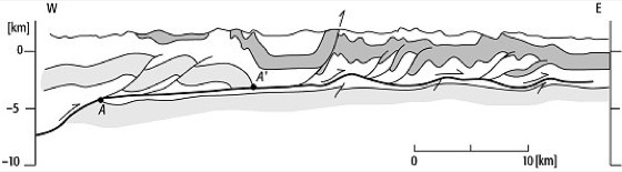 blinde Scherbahn: Der Versatz A-A' einer großen Überschiebung wird weiter östlich von kleineren Überschiebungen und Falten aufgenommen; die Überschiebung ist "blind". blinde Scherbahn: