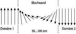 Blochwand, Übergangsbereich von etwa 100 nm Dicke, in dem die Richtungen der magnetischen Elementardipole stetig in kleinen Stufen zwischen zwei benachbarten magnetischen Domänen (Weisssche Bereiche) wechseln (Ferromagnetismus) ( Abb. ).