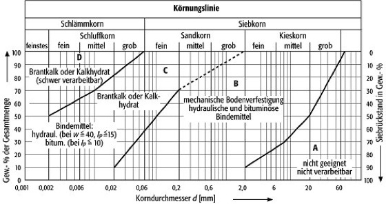 Bodenstabilisierung: Korngrößenbereiche für die verschiedenen Verfahren der Bodenstabilisierung nach Brand. Bodenstabilisierung: