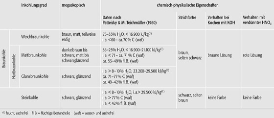 Braunkohle (Tab.): Klassifikation und Eigenschaften der Baunkohlen mit Abgrenzung zur Steinkohle. Braunkohle (Tab.):