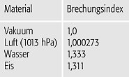 Brechungsindex (Tab.): absolute Brechungsindizes bei einer Temperatur von 20ºC und einer Wellenlänge von 550 nm.