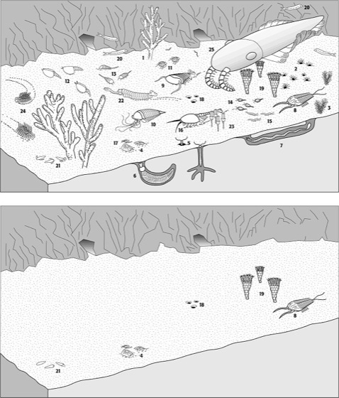 Burgess Shale: Das obere Diagramm illustriert die Zusammensetzung der Burgess Shale Fauna mit vielen Weichtieren. Das untere Diagramm zeigt die Zusammensetzung einer äquivalenten Fauna, die der normalen Fossilisation ausgeliefert war. Hier sind nur die Überreste von Tieren mit biomineralisierten Skeletten erhalten. Schwämme: 1 Vauxia, 2 Choia, 3 Pirania, 4 Nisusia. Polychaeten: 5 Burgessochaeta. Priapulide Würmer: 6 Ottoia, 7 Louisella. Trilobiten: 8 Olenoides. Andere Arthropoden: 9 Sidneya, 10 Leanchoilia, 11 Marrella, 12 Canadaspis, 13 Molaria, 14 Burgessia, 15 Yohoia, 16 Waptia, 17 Aysheaia. Mollusken: 18 Scenella. Echinodermen: 19 Echmatocrinus. Chordaten: 20 Pikaia. Tiere unbekannter Zugehörigkeit: 21 Haplophrentis, 22 Opabina, 23 Dinomischus, 24 Wiwaxia, 25 Anomalocaris. Burgess Shale: