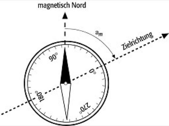 Bussole: Ablesung des Azimutes mit dem Nordende der Magnetnadel. Bussole: