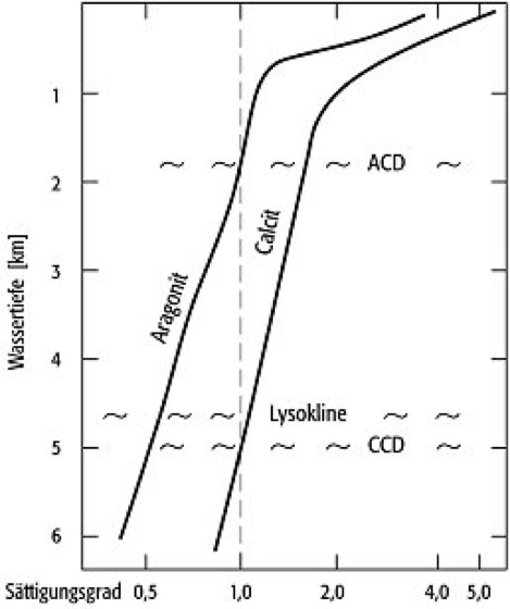 Carbonat-Kompensationstiefe, carbonate compensation depth, Wassertiefe in den Weltmeeren, unter der durch die steigende Lösungstendenz von Carbonaten bei zunehmendem Druck keine Carbonate mehr vorkommen. Die genaue Tiefenlage ist abhängig von der regionalen Chemie der Meereswässer. Dies nimmt Einfluß auf die Zusammensetzung der Tiefseeablagerungen. Man unterscheidet bei der Carbonat-Kompensationstiefe zwei Bereiche: a) die Aragonit-Kompensationstiefe (ACD, Aragonite Compensation Depth), unter der keine aragonitischen Komponenten mehr vorkommen, da sie gelöst sind. Die ACD liegt im Pazifik lokal bei weniger als 300 m Wassertiefe, im Atlantik zwischen 2 und 2,5 km. Damit befindet sie sich stets in geringerer Wassertiefe als die b) Calcit-Kompensationstiefe (CCD, Calcite Compensation Depth) ( Abb. 1 ). In dieser Tiefenlage kann kein Calcit mehr akkumuliert werden, da die Calcitzufuhr durch Lösung ausgeglichen wird (Lysokline). Die Lösungsrate von Calcit wird in besonderem Maße durch den CO2-Gehalt des Meerwassers bestimmt. Dieser ist eine Funktion der Temperatur, des Drucks, des Alters der Wassermassen und der enthaltenen Menge an oxidiertem organischen Material. Im Pazifik liegt die CCD im äquatorialen Bereich bei 4,5-5 km, im äquatorialen Atlantik wenig tiefer bei ca. 5 km. Sie steigt zu den Polen und zu den Schelfbereichen hin an ( Abb. 2 ). Die Tiefenlage der CCD variiert auch in der Zeit. Es gibt einen allgemeinen Trend für eine relativ flache CCD im Eozän mit nachfolgender Absenkung im Oligozän und Miozän. Dies mag an der Entwicklung von Meereis in hohen Breiten liegen, die veränderte Zirkulationsmuster und Temperaturverteilungen in den Meeren nach sich zog. [AA, DM]