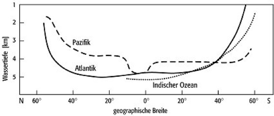 Carbonat-Kompensationstiefe 2: Position der CCD in Abhängigkeit von der geographischen Breite für den Atlantik, den Indischen Ozean und den Pazifik. Carbonat-Kompensationstiefe 2: