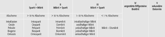 Carbonatklassifikation (Tab. 1): Carbonatklassifikation nach Folk (1959, 1962) mit Ergänzungen von Flügel (1974). Carbonatklassifikation (Tab. 1):
