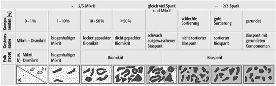 Die Gesteinsnamen setzen sich nach Folk (1959, Tab. 1 ) aus der Abkürzung des jeweils dominierenden Allochem-Namens und dem Namen des Bindemittels zusammen, z.B. Intrasparit, Oosparit, Biomikrit, Pelmikrit. Bei weniger als 10% Allochemen wird das Gestein z.B. als biogenführende oder ooidhaltige Mikrite bezeichnet usw. Gesteine gar unter 1% Komponenten heißen Mikrit oder falls spariterfüllte Hohlräume im Mikrit vorliegen Dismikrit. Die Komponentengröße geht durch die Anfügung der Endung -rudit, z.B. Onkomikrudit, in den Gesteinsnamen ein. Außerdem lassen sich Beimengungen, z.B. Quarz, Glaukonit u.a., durch Zusätze im Namen festhalten. Nach dem Texturspektrum unterschied Folk innerhalb der drei Hauptgruppen acht Untergruppen, die in Abhängigkeit von der Wasserenergie entstehen ( Tab. 2 ).