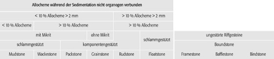 Die Carbonatklassifikation nach Dunham (1962) basiert auf der Art der Komponenten-Bindung. Dabei werden schlammgestützte Gefüge von komponentengestützten Gefügen unterschieden. Daraus resultieren vier Gesteinsgruppen. Hinzu kommt eine weitere für Riffgesteine. Embry & Klovan (1972) erweiterten die Klassifikation um die Differenzierung der boundstones und der Riffschuttgesteine ( Tab. 3 ). [DM]
